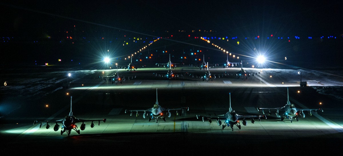 南韓Kunsan群山空軍基地美國空軍第8戰鬥機聯隊20架F-16戰機進行Elephant Walk大象漫步作業,這也是Beverly Pack 16-2演習的一部分自2月2~6日實施.