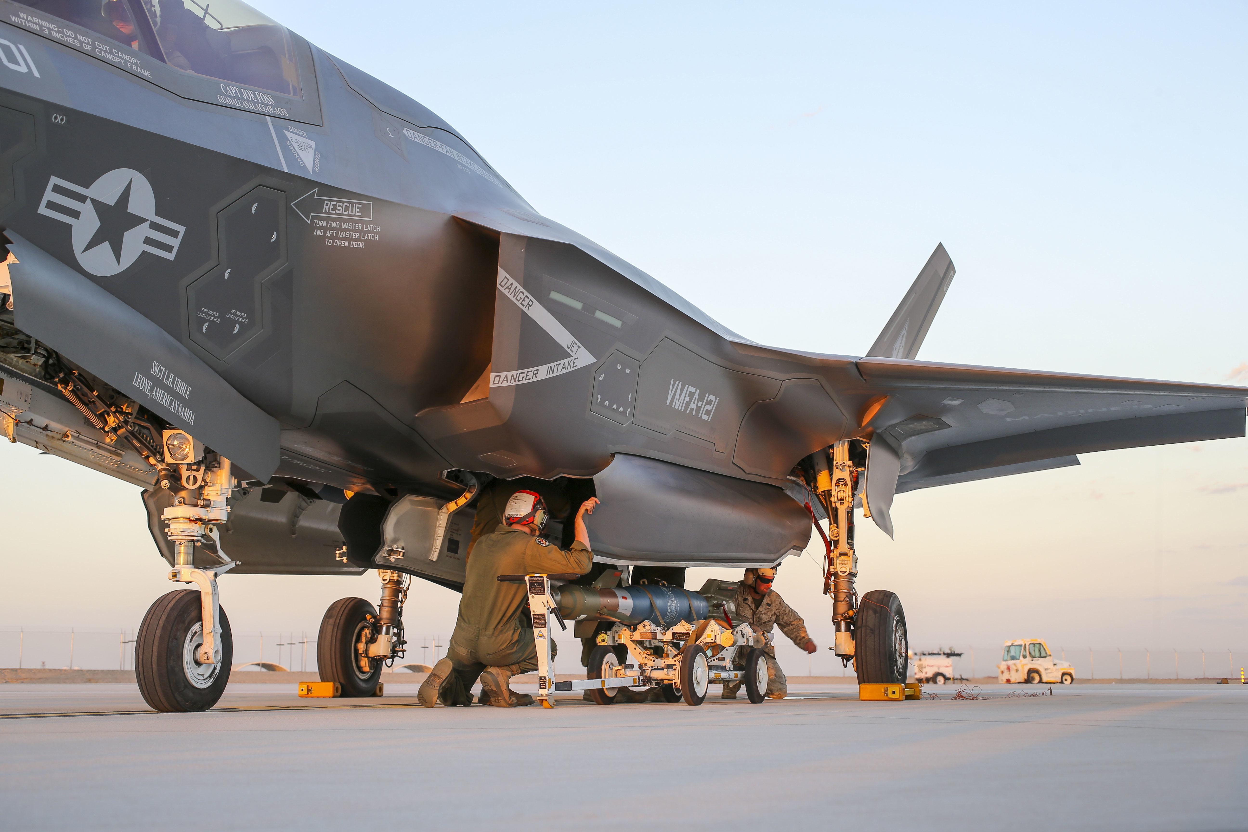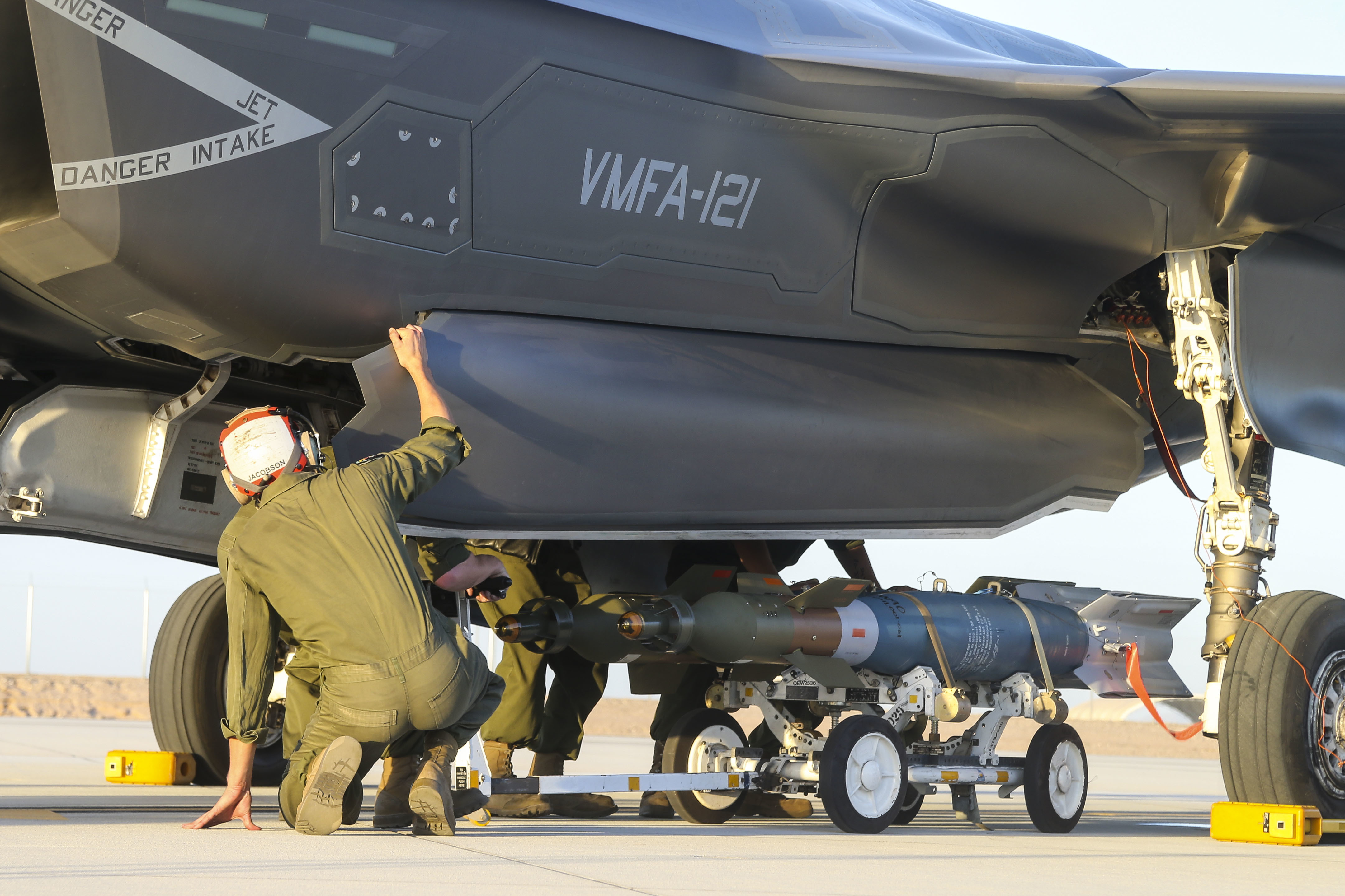 美國陸戰隊VMA-211海上攻擊中隊F-35B戰機與MAWTS-1海軍航空武器戰術中隊首次進行GBU-12 Paveway II雷射導引炸彈地面熱掛載作業.