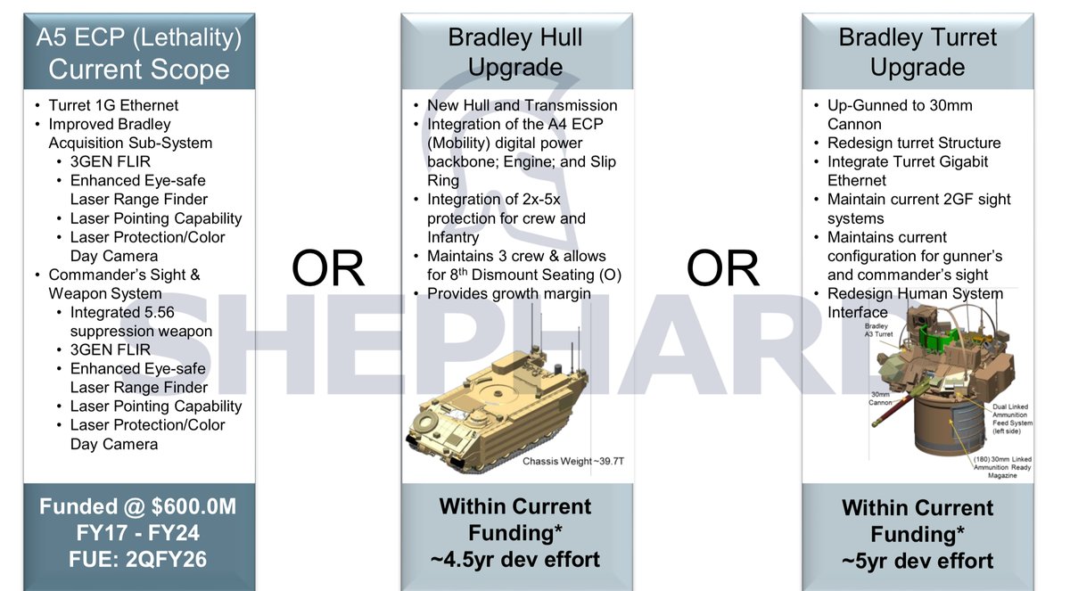美國陸軍計畫推動新型M2A5 Bradley裝甲步兵車輛,包括全新40噸車體和底盤設計(可搭載8名武裝士兵)和配備M2A3 Bradley裝甲步兵車輛新型整合式砲塔並搭載1門30公厘機砲設計.
